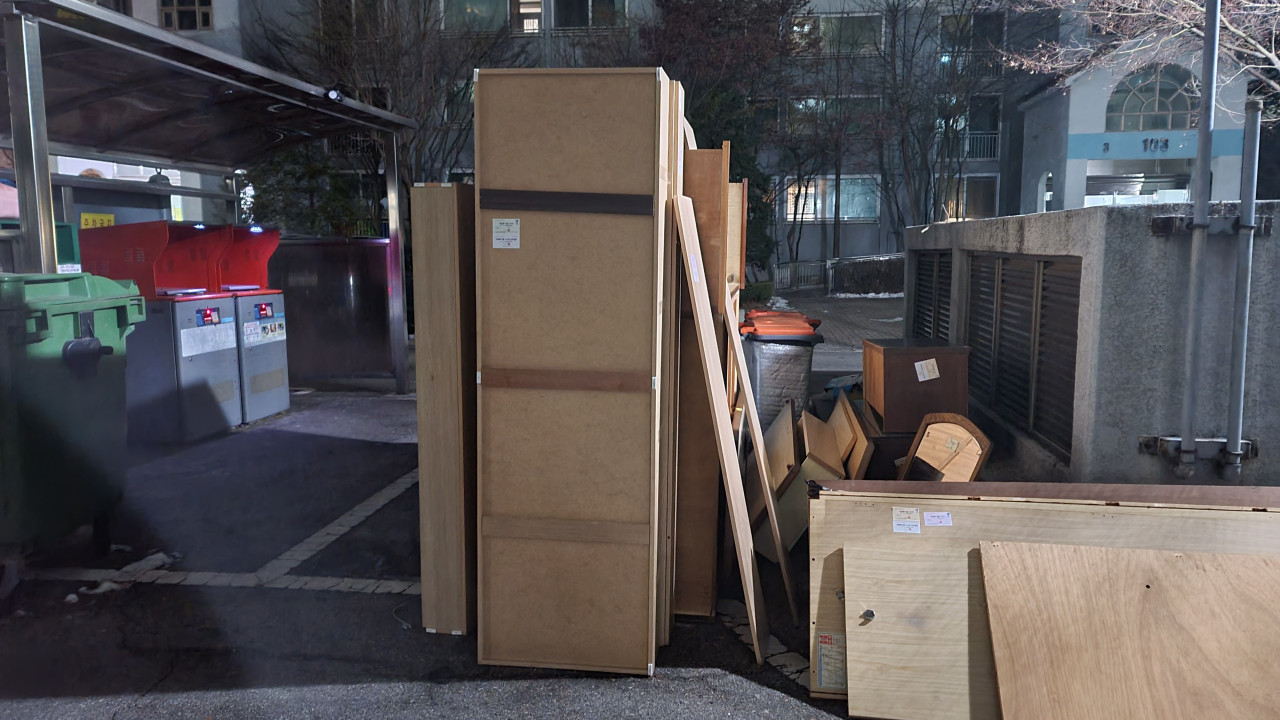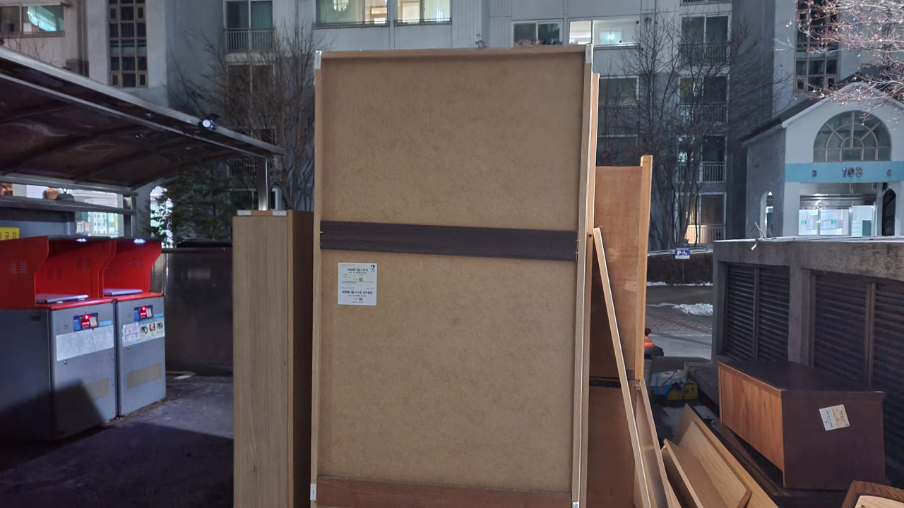여차저차해서 분해한 침대를 밖에 대놓고 사진과 같이 잘 보이는 곳에 폐기물스티커를 붙여줍니다.