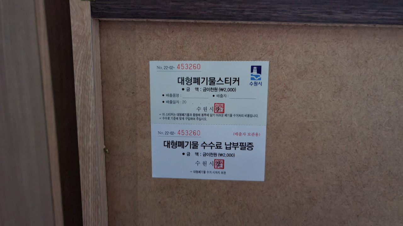 침대를 버리기 전 이렇게 생긴 대형폐기물스티커를 집앞 편의점에서 구매합니다. 구매 전 관리실에 들러 침대 크기를 말해주면 얼마치를 붙이라고 언급을 해주는데 본인이 판단하지 말고 물어보시기 바랍니다. 제 침대는 8000원이었으며 수원시 침대 폐기물 처리가격도 실제 8000원으로 확인되었습니다.