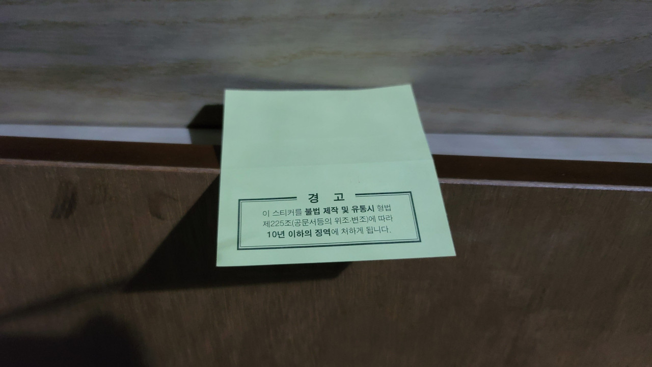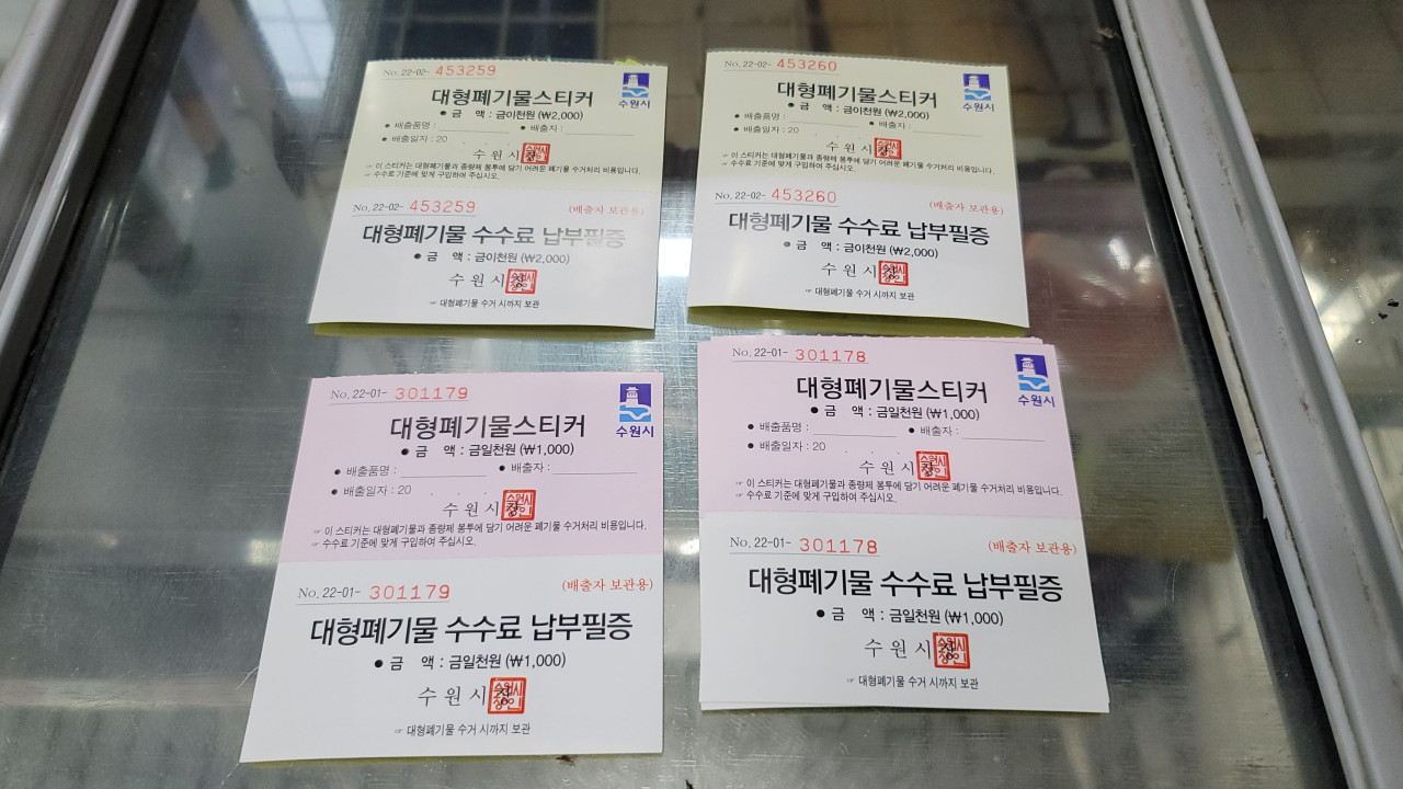 대형폐기물스티커를 위조하여 제작하게 되면 공문서 위조 등으로 처벌을 받을 수 있다는 경고가 뒤에 붙어 있습니다. 인터넷에서 출력하면 스티커가격보다 좀더 저렴하다던데 프린터가 없는 집이라 PASS~